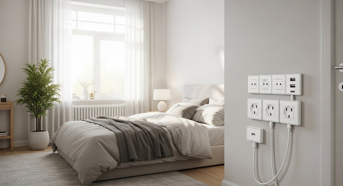 ダブルベッドや二人暮らしの場合は左右に2口ずつ設けると取り合いを避けられます。お互いに照明や充電器を使っても問題なく、ベッドサイドテーブルの位置に合わせやすくなります。個別にスイッチを付けると夜間の操作が楽です。