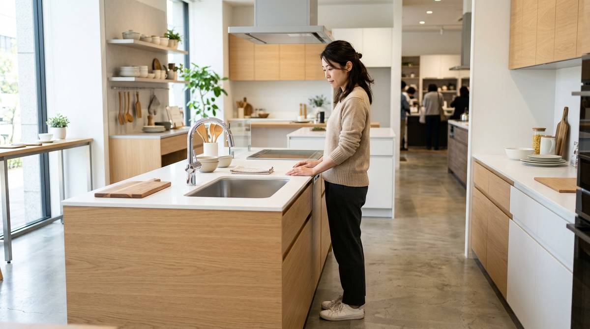 ショールームでの体験には、いくつかの「罠」が潜んでいます。まず、ショールームの床は非常に平滑で歩きやすいため、家のキッチンで感じる疲労感とは条件が異なります。また、展示されているキッチンは周りに十分なスペースがあり、開放感があるため、実際よりも「使いやすそう」に見えてしまう心理的な効果もあります。